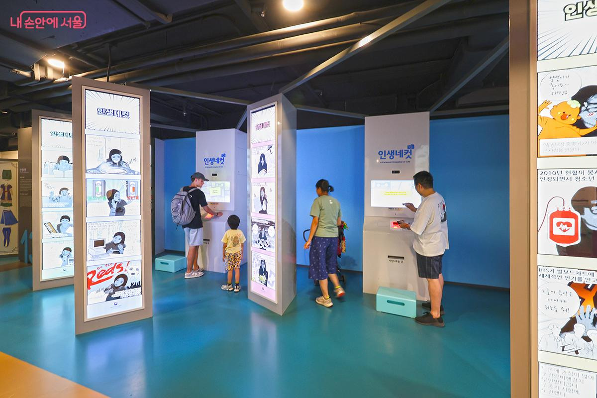 먼저 현대사 놀이터에 입장을 하면 입구에서 체험카드를 발급받을 수 있다. 자신의 출생연도와 가장 흡사한 연도의 캐릭터를 선택해 버튼을 눌러 발급받으면 된다. 하지만 좀 더 색다른 방법으로 선택하고 싶다면 벽면에 설치된 '캐릭터 선택 가이드'를 이용해도 좋다. 카드를 발급받았다면 1번부터 13번까지 짜인 각 코너들을 따라 차례로 이동하며 자유롭게 체험하면 된다.