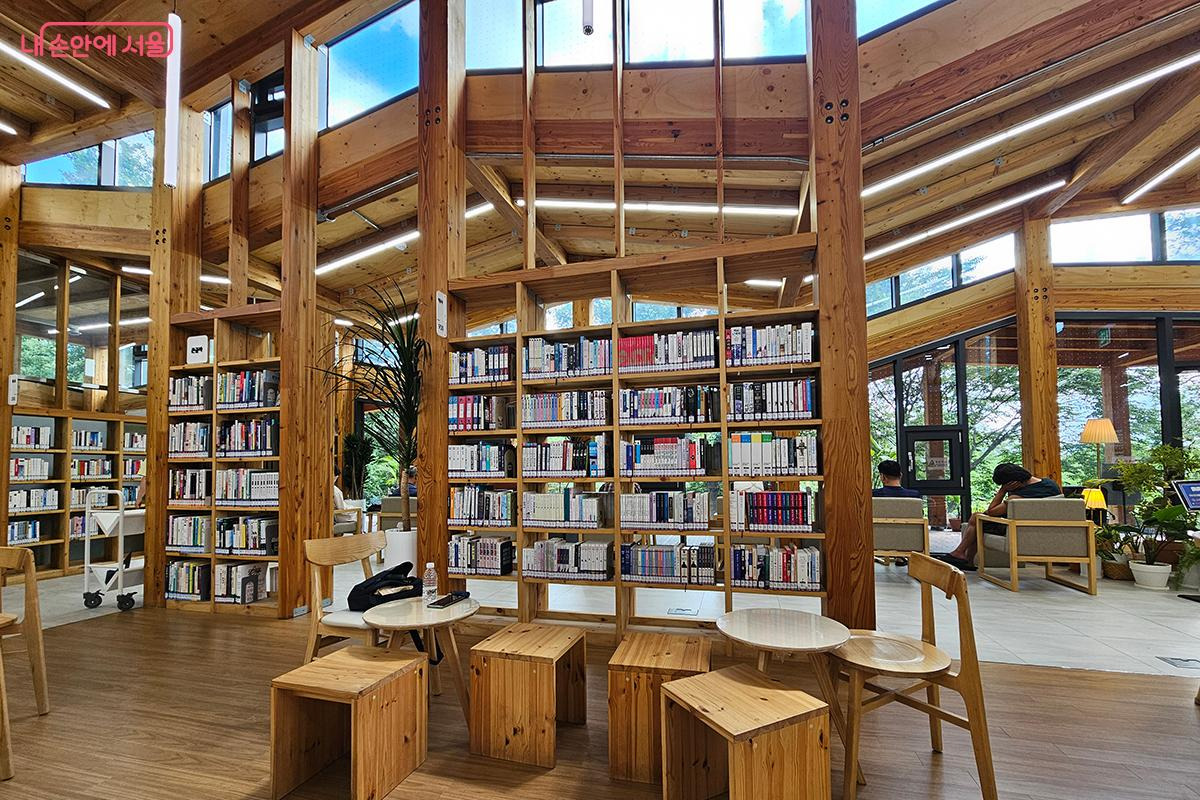 나무로 지어진 도서관은 마치 숲과 하나가 된 듯, 겸손하고도 단단한 존재감을 뽐내고 있었다. 2023년 대한민국 목조건축대전 수상작 답게, 외관부터 눈을 뗄 수 없을 정도로 아름다웠다. 차가운 철과 콘크리트가 아닌, 온기 어린 목재로 지어진 공간에서 왠지 모를 포근함을 느꼈다.