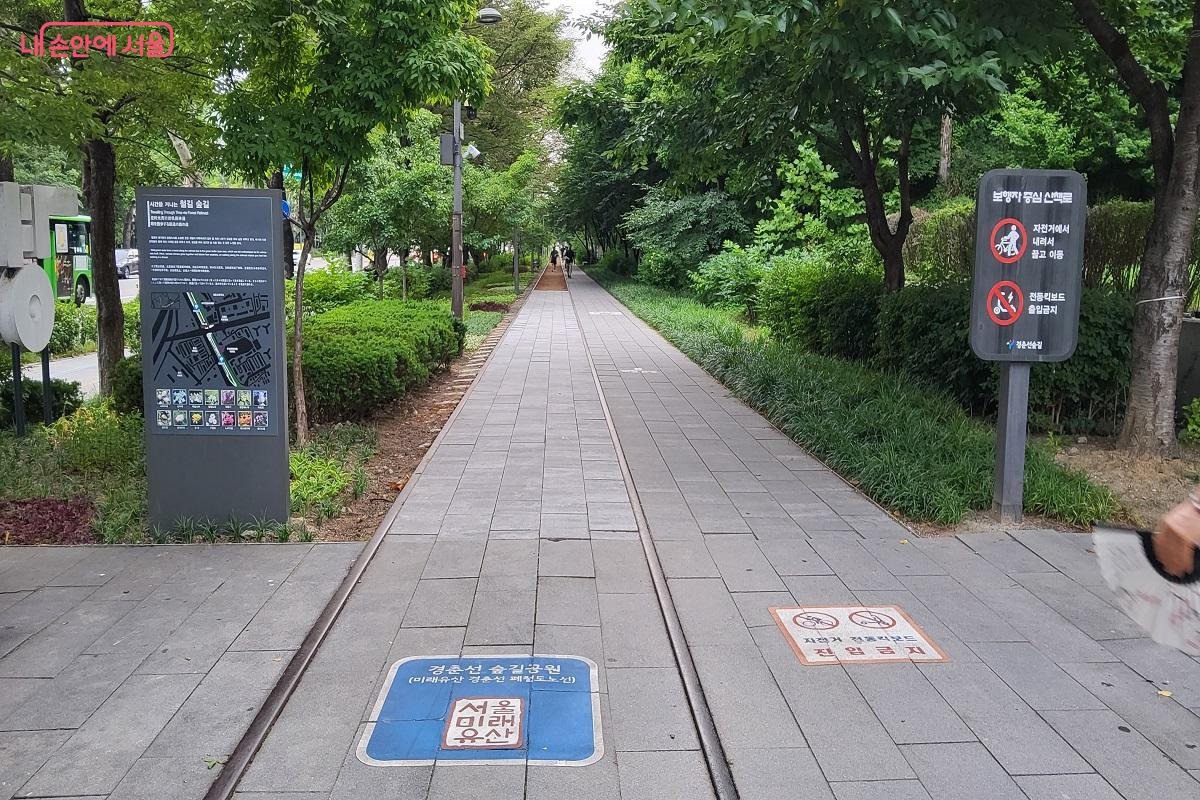 그래도 그늘이 있는 곳을 원한다면 경춘철교를 지나 바로 소나무숲으로 들어가면 철길을 옆으로 바라보며 걸을 수 있다. 소나무숲길에는 황톳길, 운동기구와 벤치 등 휴식과 건강을 위한 시설이 마련되어 있어 남녀노소 누구나 편하게 이용할 수 있다.