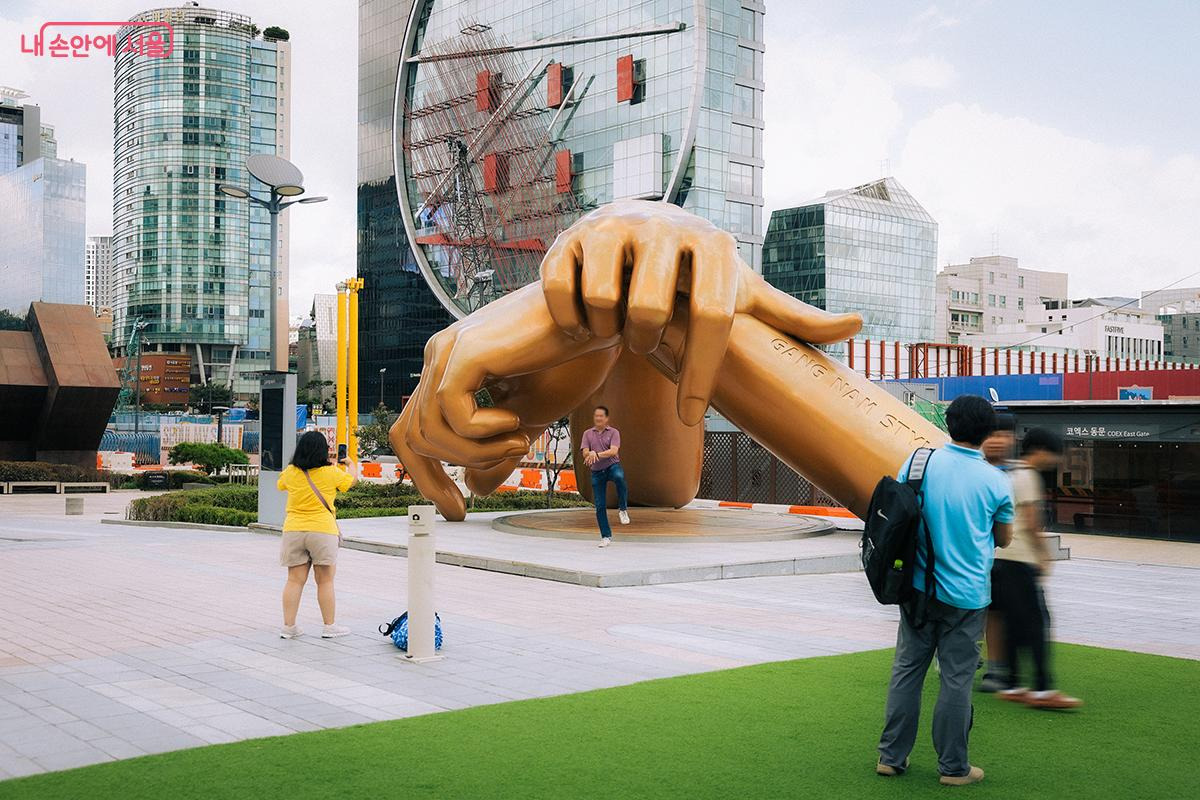 강남스타일 조형물(말춤 손목 동작을 형상화) 앞에서 많은 관광객들이 포즈를 취하고 기념 사진을 남기곤 한다. ©김아름