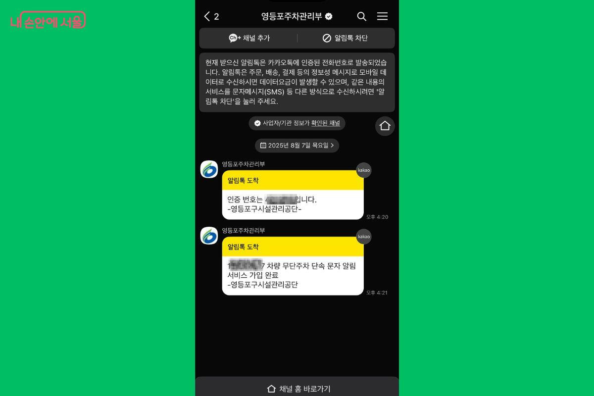 인증과정에서 무단주차 단속 문자 알림 서비스에 대한 내용을 확인할 수 있다. ©영등포구