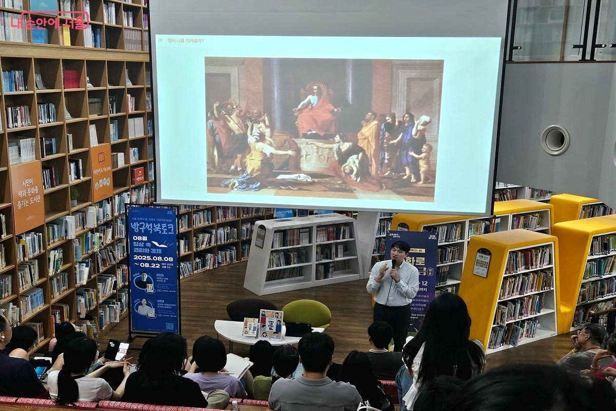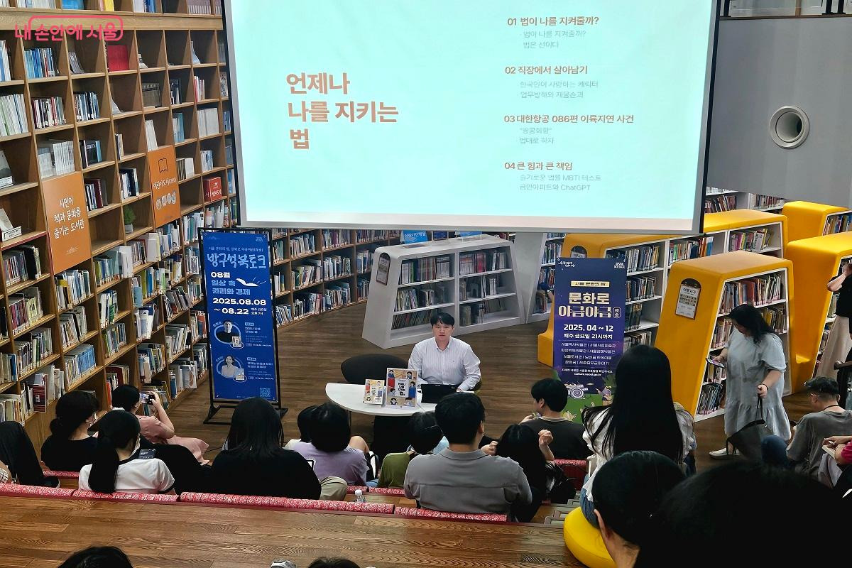 이번 북토크는 '일상 속 권리와 경제'라는 주제로 총 2회로 구성되어 있다. 그 중에서도 8월 8일에 열린 북토크에 참석했는데, 윤종훈 변호사가 우리가 꼭 알아야 하는 일상 속 법률 상식을 들려주었다. 서울도서관은 매주 금요일마다 저녁 9시까지 개방하고 '문화로 야금야금' 야간 특별 프로그램을 운영하고 있는데, 이 날의 북토크는 그 일환이기도 했다.