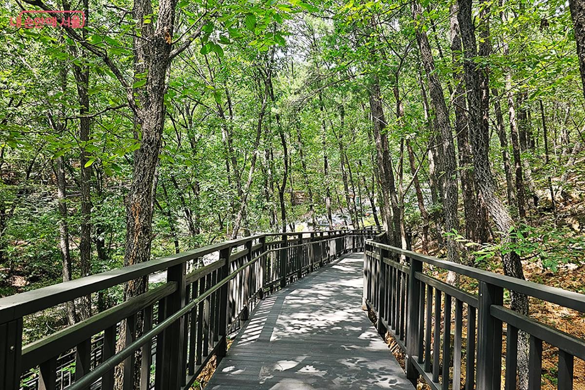 수락휴를 충분히 구경한 후 향한 곳은 수락산 동막골 자연휴양림의 무장애 숲길이었다. 완만한 경사로 조성되어 누구나 부담 없이 걸을 수 있다. 숲길을 따라 천천히 걸으며 귓가에 들리는 새소리, 바람에 흔들리는 나뭇잎 소리에 귀를 기울였다. 도심에서는 좀처럼 들을 수 없는 자연의 소리들이 마음속 깊은 곳까지 스며들어 내면의 소음까지 잠재워주는 것 같았다.