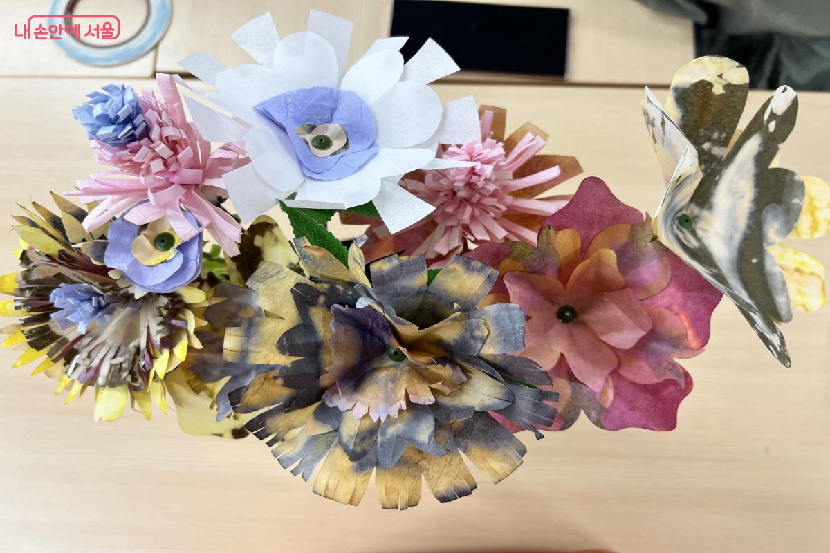 물들인 한지로 하나하나 형태를 잡아 꽃을 만들었다. ©박지영