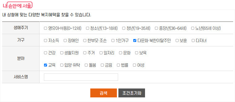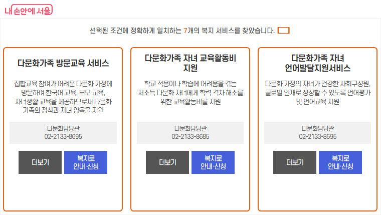 서울복지포털 내 ‘복지서비스’ 화면 예시. (다문화 가구, 교육 분야를 선택한 검색 결과)