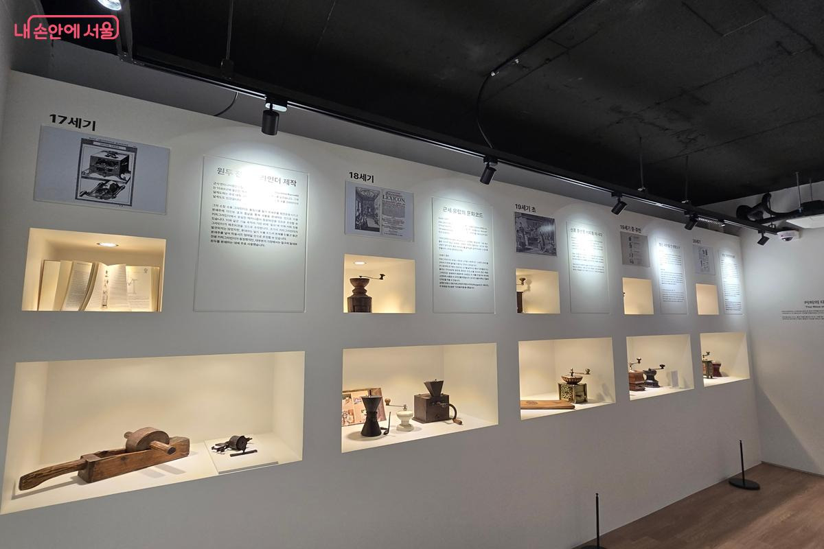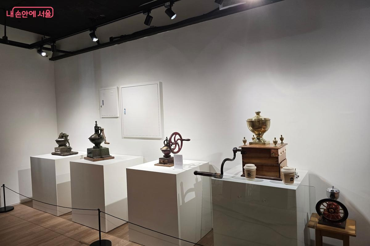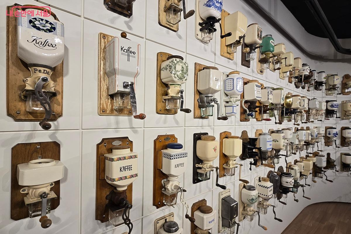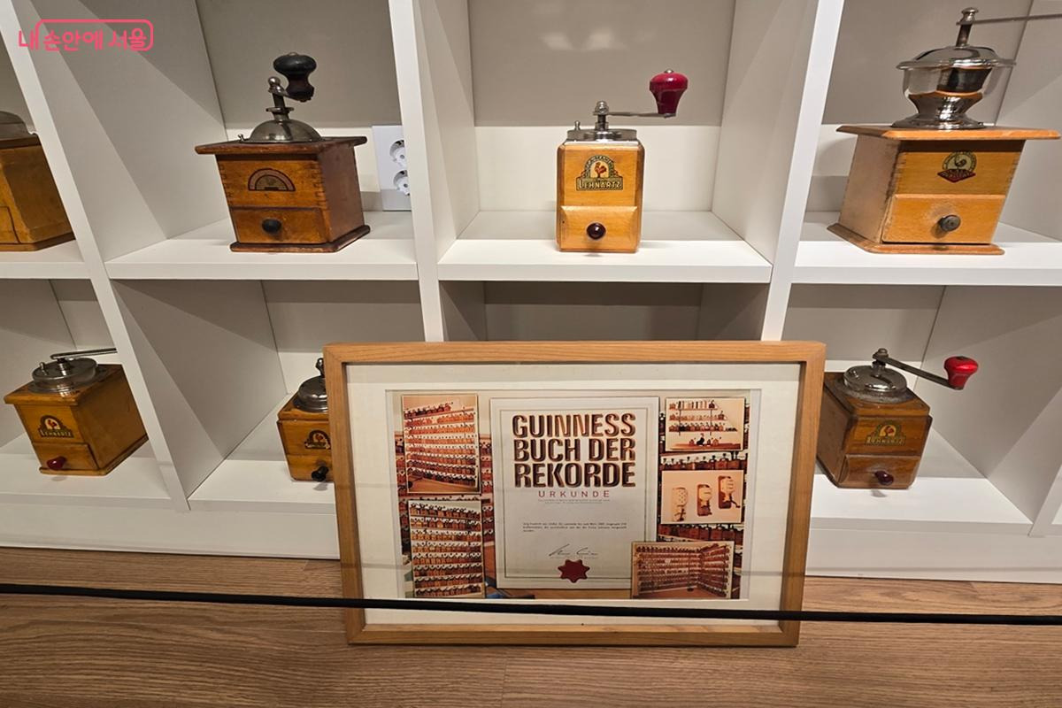 전시장에는 기네스북에 등재된 수동 커피 그라인더 컬렉션도 포함돼 있어 눈길을 끈다. 독일 레나츠(Lehnartz)사가 제작한 커피 그라인더 시리즈 전체를 소장한 사례로, 2011년 기네스에 공식 등재됐다. 이 컬렉션은 원 소장자가 2005년 사망한 뒤 유족이 수집품을 정리하는 과정에서 여러 수집가들에게 공개됐고, 당시 수집가로 참여한 이승재 관장이 그 가치를 알아보고 소장하게 됐다. 개별 물건의 집합을 넘어 오랜 전통과 역사적 맥락을 함께 보존한 수집이라는 점에서 의미가 크다. 이 밖에도 시대·지역·소재·용도에 따라 다양한 수동 커피 그라인더를 만나볼 수 있다.