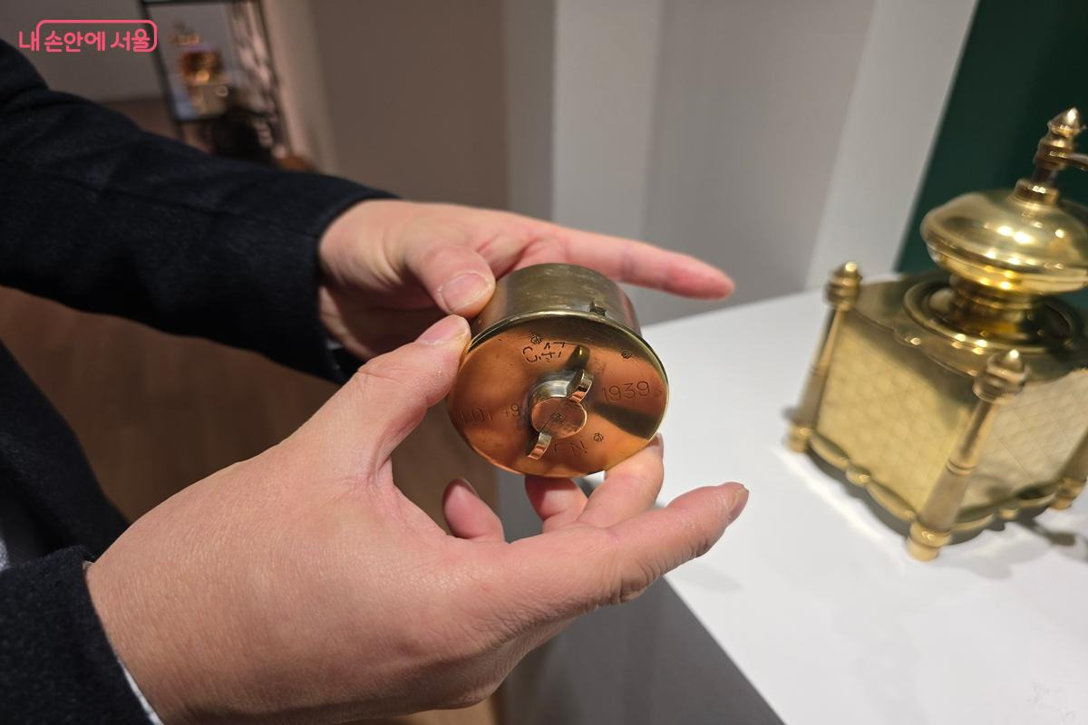 전쟁 후 평화의 시대를 알리는 상징적 의미가 담긴 1939년에 제작된 황동 커피 그라인더 ©강사랑